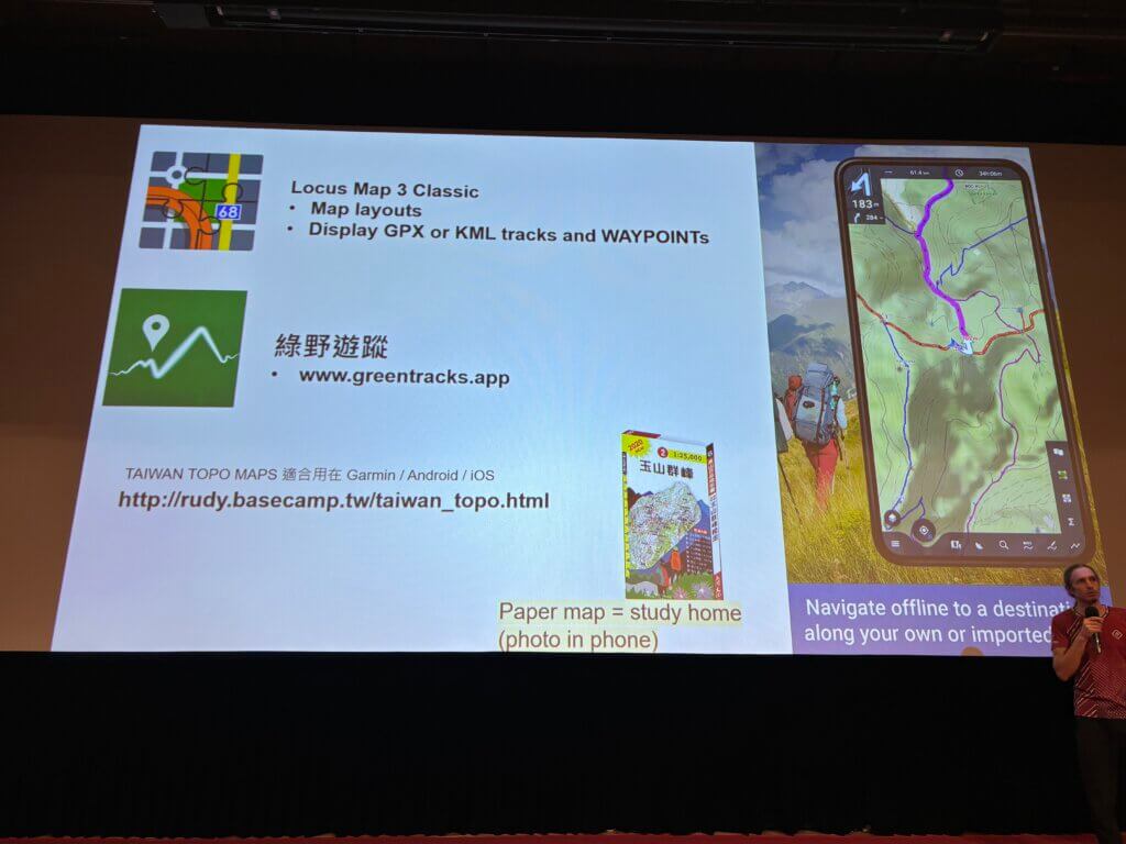 - 上山前一定要學會使用離線地圖,或用地圖軟體找到自己的座標,出事要想辦法自身座標送出求援,他推薦的是 Mapy 這套軟體,Android/iOS 都有